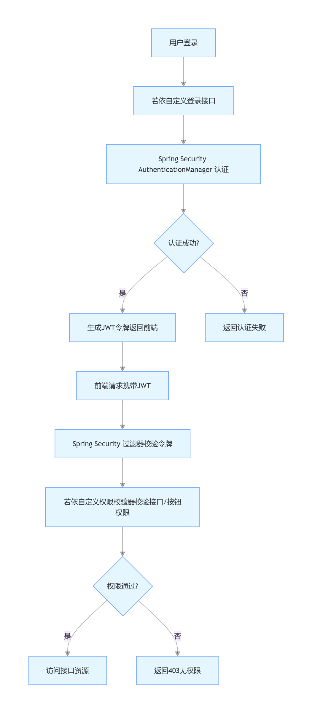 若依框架原生已深度整合 Spring Security,并非 “额外整合”,其核心逻辑是: